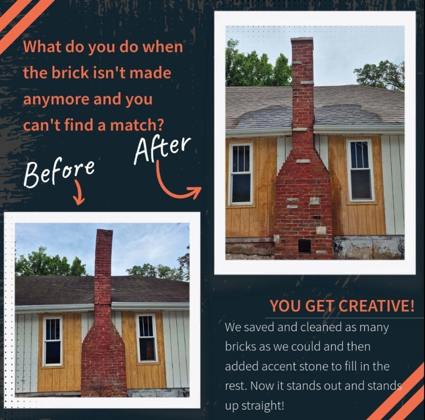 We invite you to explore our portfolio of finished projects and see what's truly possible. Get inspired by our creative solutions and get excited about the potential for your own space. We pride ourselves on turning challenges into unique features, like our signature 'before and after' chimney repair where we revitalized a leaning structure with a blend of original brick and strategically placed stones.